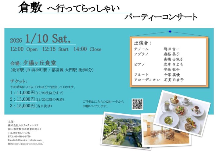 2026年1月10日(土)ランチタイムに開催予定の「倉敷へ行ってらっしゃいパーティコンサート」のご予約が始まりました!
